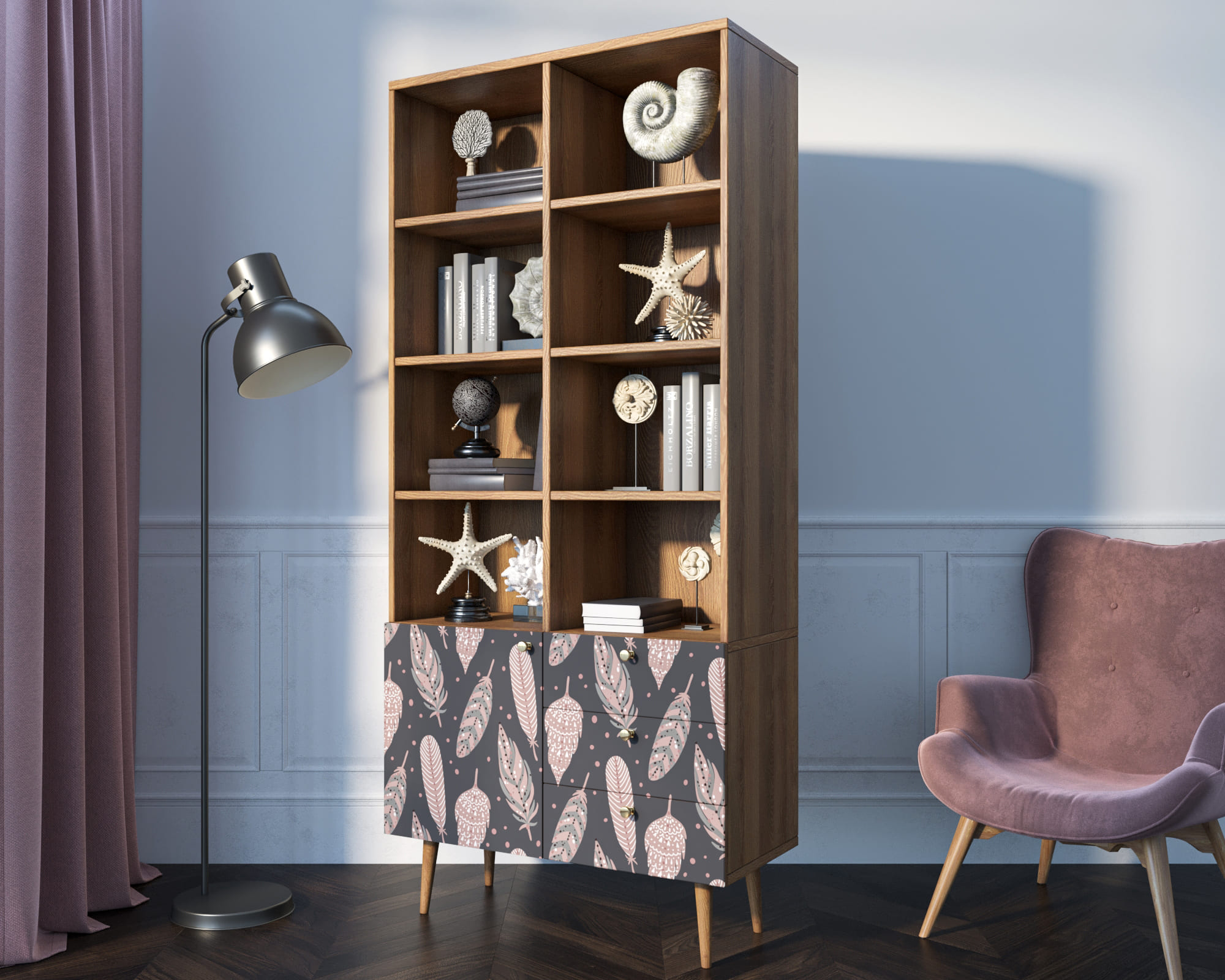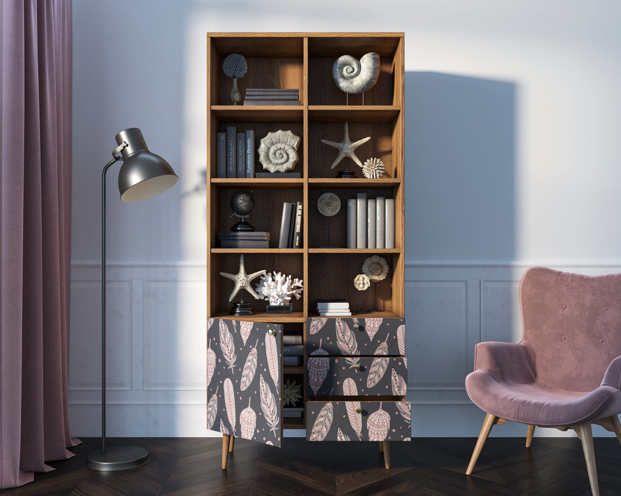 Стеллаж с дизайнерским принтом на фасаде имеет три небольших ящика полного выдвижения на шариковых направляющих. Левая секция за дверкой разделена полкой, которая регулируется по высоте. Ноги изготовлены из прочного массива ясеня.
