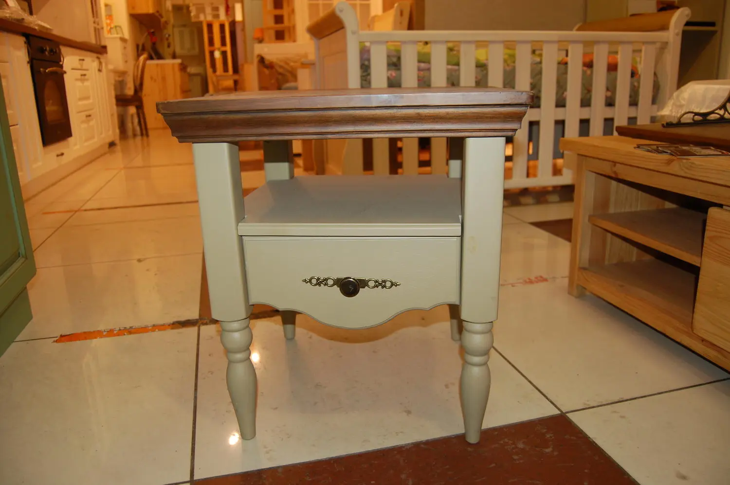 Цена указана за изделие в бесцветном лаке. На титульной фотографии цвет тумбы - шоколад скрэп /столешница - бейц антик. Стоимость зависит от выбранного покрытия. При заказе мебели в составном цвете цена считается по более дорогому.Материал - сосна, дно ящиков - ДВП белого цвета.