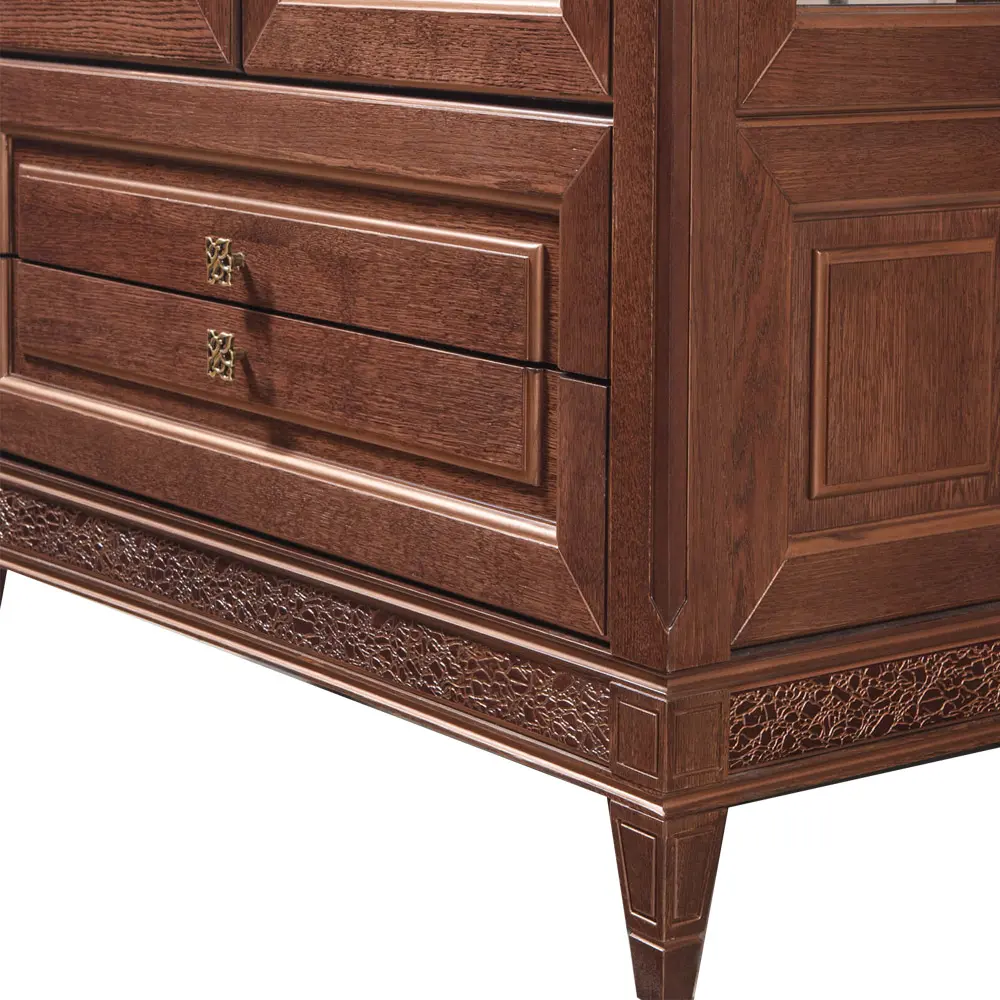 Шкаф с витриной : с резной верхней крышкой и ножками, строгими линиями фрезеровки, накладками с оригинальным тиснением и роскошной лицевой фурнитурой делают коллекцию элегантной и неповторимой.