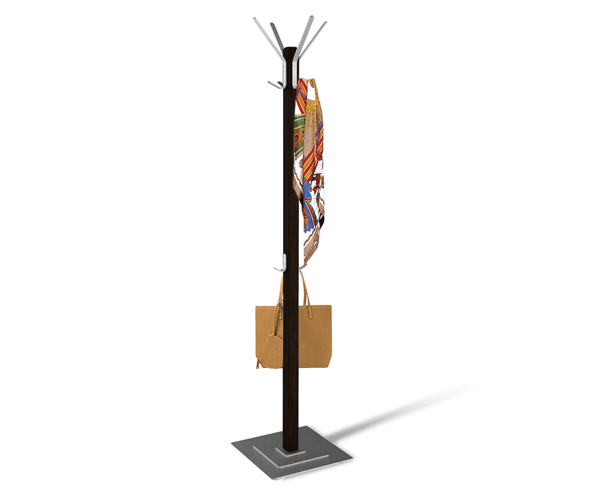 Стойка выполнена из массива древесины, брус толщиной 46х46 мм.; крючки - из металла.