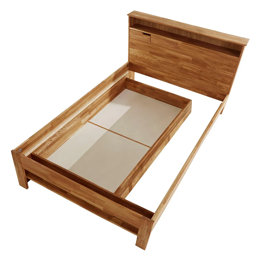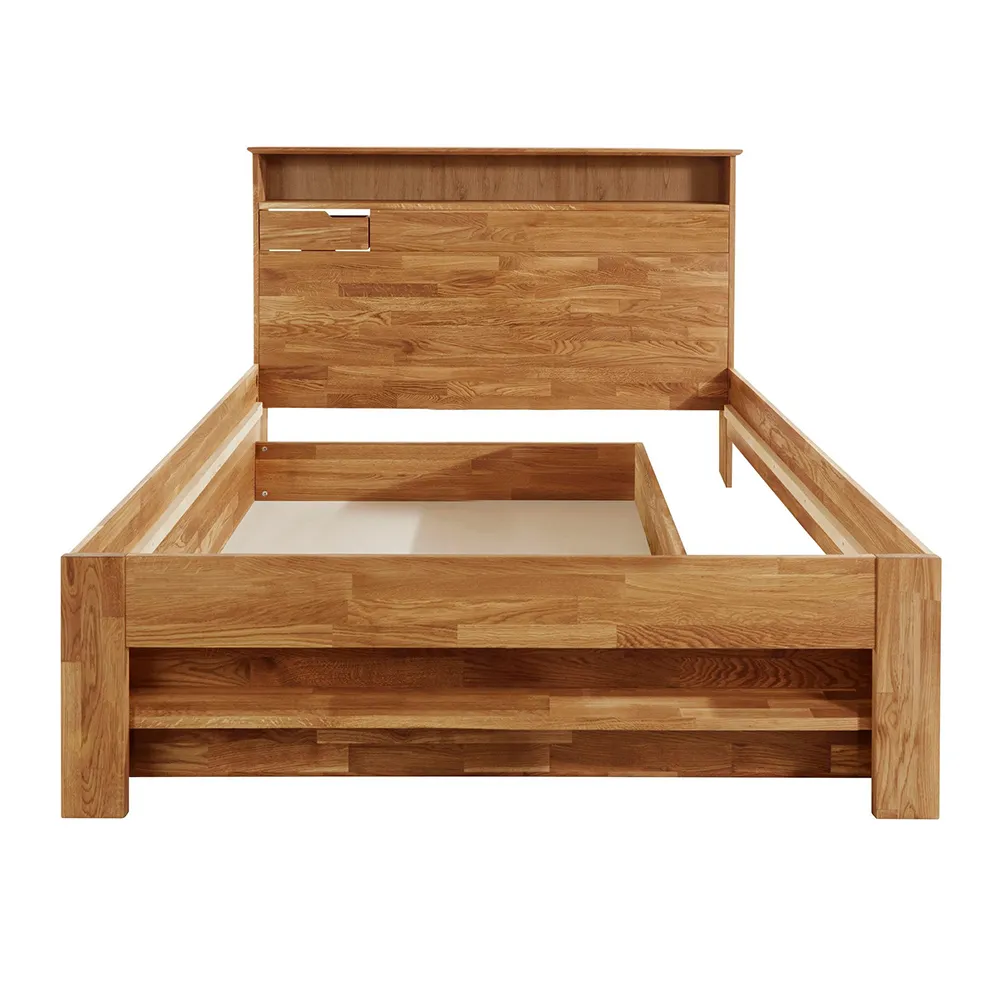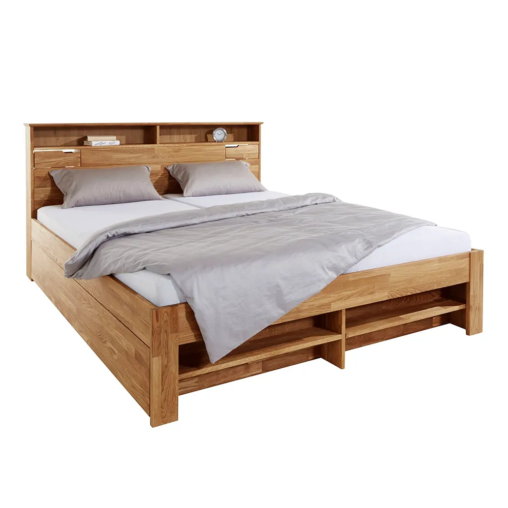 В изголовье и в изножье кровати есть широкие встроенные полки, в изголовье также сделаны маленькие выдвижные ящики для мелочей с каждой стороны. Кроме этого, кровать комплектуется двумя выкатными ящиками для хранения одежды и постельного белья.