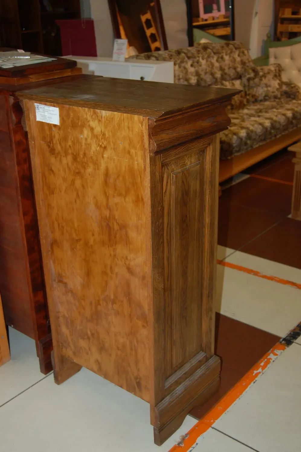 У комода глухая дверца, за которой расположено отделение с тремя полками. На дверцу устанавливается ручка или замок с ключом, по выбору. Над дверцей расположен небольшой выдвижной ящик без направляющих. Комод отличается небольшими размерами и весом, подойдет даже для небольшого помещения: ширина, глубина и высота 570х380х1080 мм, вес 44 кг. Поставляется в собранном виде, гарантия на изделие – 1 год.