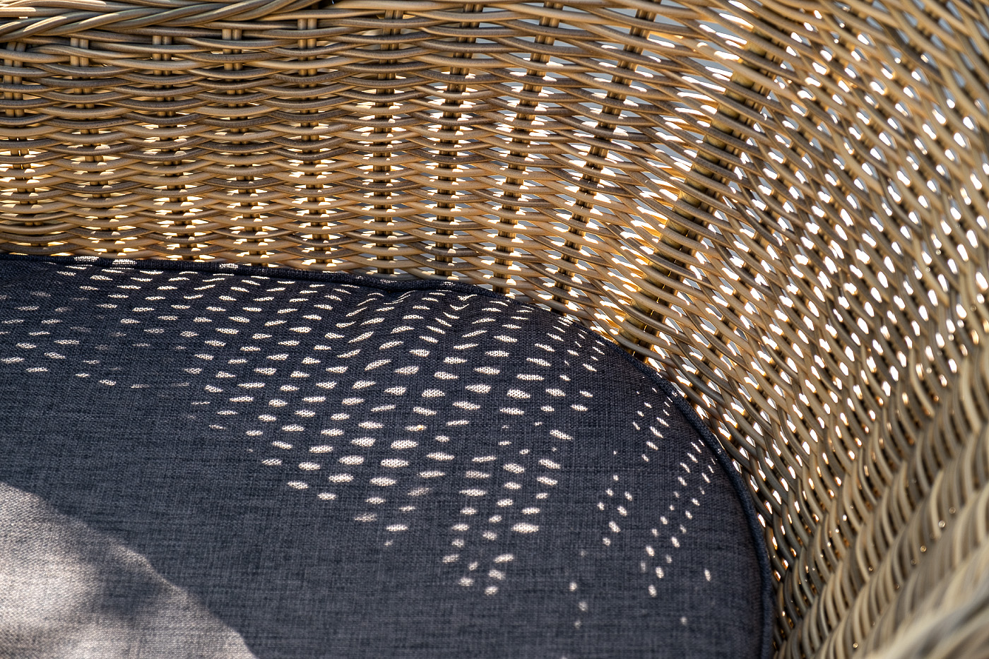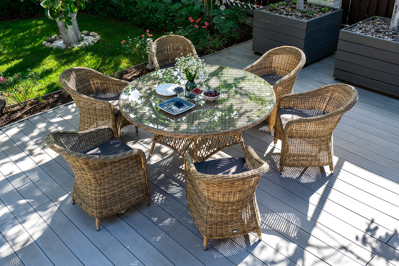 В комплект входит круглый обеденный стол «Эспреззо» (1500×1500×750 мм) с ударопрочной стеклянной столешницей и 6 кресел коллекции «Равенс» 680×570×810 мм. "Эспреззо" плетеный круглый стол, диаметр 150 см, цвет соломенный 1шт. 1 500Х1 500Х750, "Равенс" плетеное кресло из искусственного ротанга, цвет соломенный с серой подушкой 6шт. 570Х680Х810,