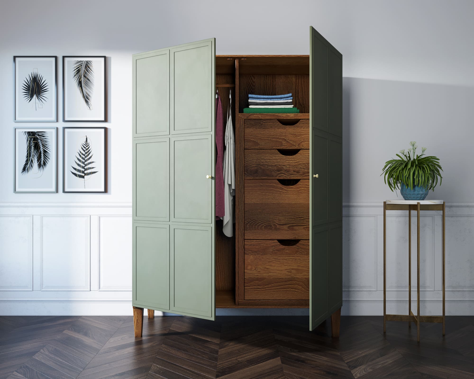 Фасады имеют приятный зеленый оттенок. Корпус шкафа выполнен из шпона ясеня.
