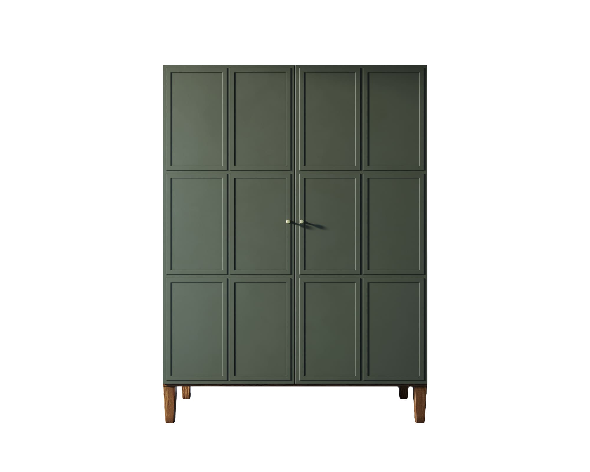 Основательность конструкции придают два фасада с прямыми рамками и ножки из массива ясеня в цвете орех.