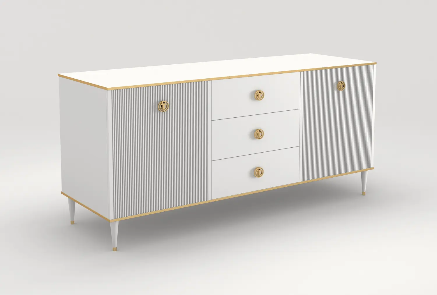 Фрезерованные фасады изящно сочетаются с металлическими ручками, ножки с золотой каймой завершают элегантный стиль модели.