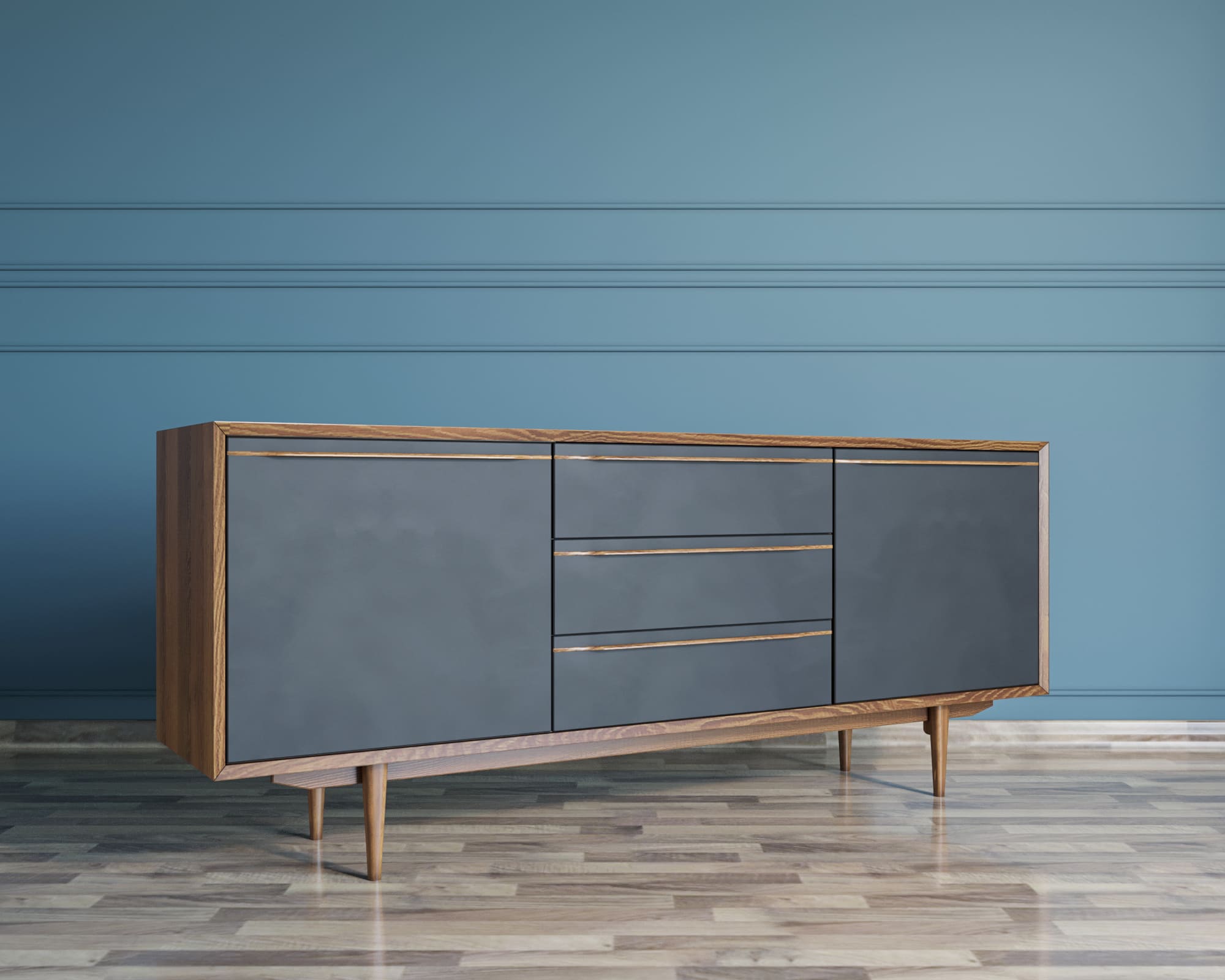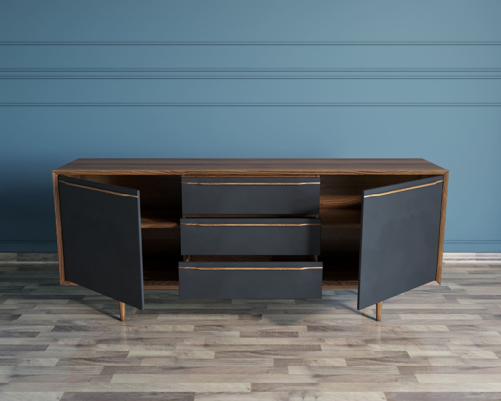 Наполнение: 3 ящика и 2 полки с левой и с правой стороны за распашными фасадами.