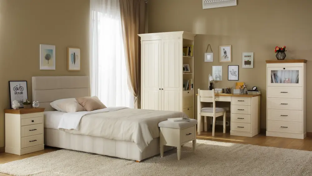 Спальная мебель «Дания» не только красивая, но и удобная в использовании. Ящики перемещаются на надежных шариковых направляющих полного выдвижения (без доводчиков), а под высокими ножками удобно мыть пол, не отодвигая мебель.